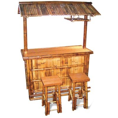 Bamboo Tiki Bar Set Hand crafted bamboo construction Perfect for indoor or outdoor use Two 30-inch bar stools included Included hanging glass rack Bar size 7-1/2 feet by 5.9 feet by 2 feet